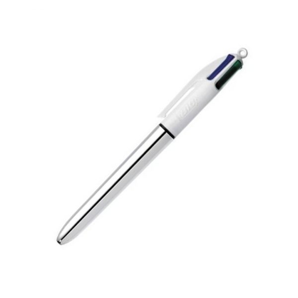 Penna bic, con i quattro colori dell’inchiostro rosso, nero, verde e blu in un unica penna. Tratto di scrittura medio, punta 1,0 mm. Questa versione si differenzia per avere la parte inferiore del fusto metallizzata di colore argento, ideale per scuola e ufficio.