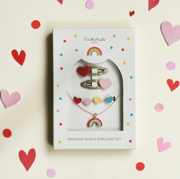 La nostra scatola regalo vintage con capelli e gioielli arcobaleno è il regalo perfetto! Il set include due teneri cuori con fermagli avvolti in un nastro dorato, una collana arcobaleno e un braccialetto a forma di cuore colorato. Ogni set è splendidamente presentato in una scatola regalo delle dimensioni perfette per essere spedita nella cassetta della posta! Cosa troverai alla fine dell’arcobaleno?