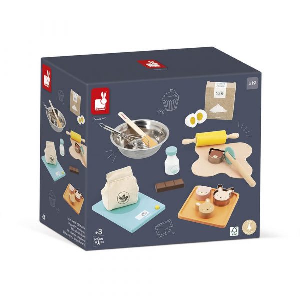 Mmm, che magnifico odorino proviene dalla mini cucina dei bambini! Con questo set di accessori in legno da pasticceria, i piccoli golosi che amano cucinare i dolci potranno imitare i grandi in modo realistico! Questo set contiene tutto l’occorrente per dare libero sfogo alla creatività e all’immaginazione dei piccoli pasticceri in erba! Primo passo della ricetta: pesare gli ingredienti con la graziosa bilancia in legno. Questo kit da pasticceria include una confezione di zucchero in cartone, un sacchetto di farina in stoffa, una bottiglia di latte in legno, un uovo con chiusura a strappo e una barretta di cioccolato. Spetta ai bambini combinarli secondo i loro desideri! Quindi sarà necessario mescolare gli ingredienti nella ciotola con la frusta in metallo e stendere il magnifico impasto in feltro con il mattarello facile da afferrare per le mani dei più piccoli. E la spatola permetterà di non lasciare alcun residuo nella ciotola! Quale forma darai alla pasta frolla? Perché non preparare piccoli bignè con la rotella dentellata? I due coppa pasta 2 stampini in silicone a forma di testa di orso e di coniglio permettono di realizzare 4 pasticcini tenerissimi! Questo set completo da pasticceria, adatto ai bambini dai 3 anni in su, è perfetto come accessorio delle cucine per bambini. Questo prodotto è realizzato con materiali certificati FSC® e materiali controllati.