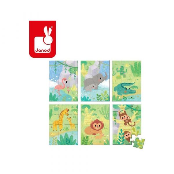 Ogni puzzle contiene 12 pezzi, in una scatolina cubica. Collezionando tutti i puzzle si ottiene un’unica figure rappresentante la giungla!