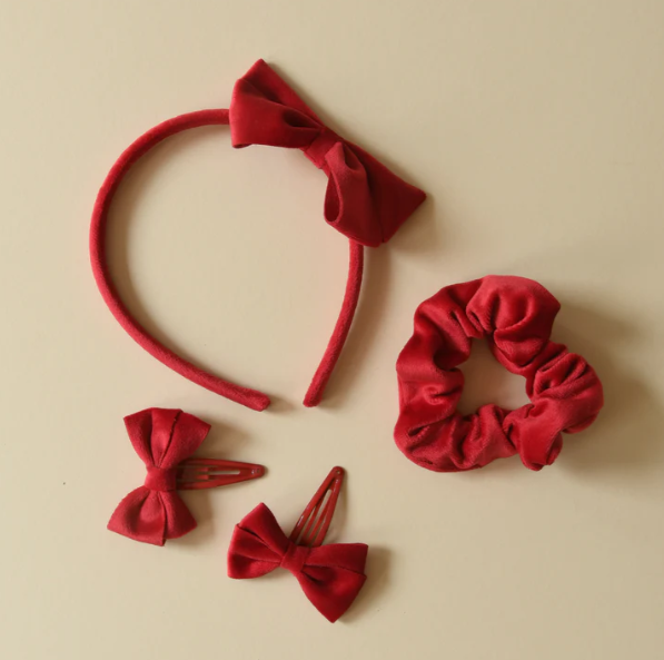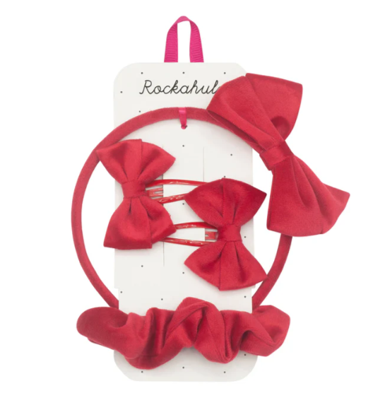 I nostri set per capelli in velluto per la scuola includono tutti gli elementi essenziali per la scuola! Il set è realizzato in morbidissimo velluto e include due fermagli a fiocco, una fascia e uno scrunchie. Praticissimi e un regalo davvero divertente, sono disponibili nei colori rosso, blu o verde.