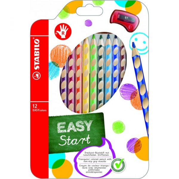 Colorare diventa easy con i pastelli STABILO EASY COLORS. Le prime matite colorate ergonomiche, differenziate per mancini e per destrimani, con fusto triangolare e sagomature anti-scivolo, per un’impugnatura rilassata. Il fondello giallo indica la versione per mancini, quello rosso per destrimani; con spazio per scrivere il nome. Diametro della mina XL, pari a 4.2 mm. Confezione da 12 colori: giallo, arancione, rosso ciliegia, rosso viola, rosa, rosa carnicino, blu oltremare, blu cielo, verde foglia, giallo verde, marrone chiaro e nero.